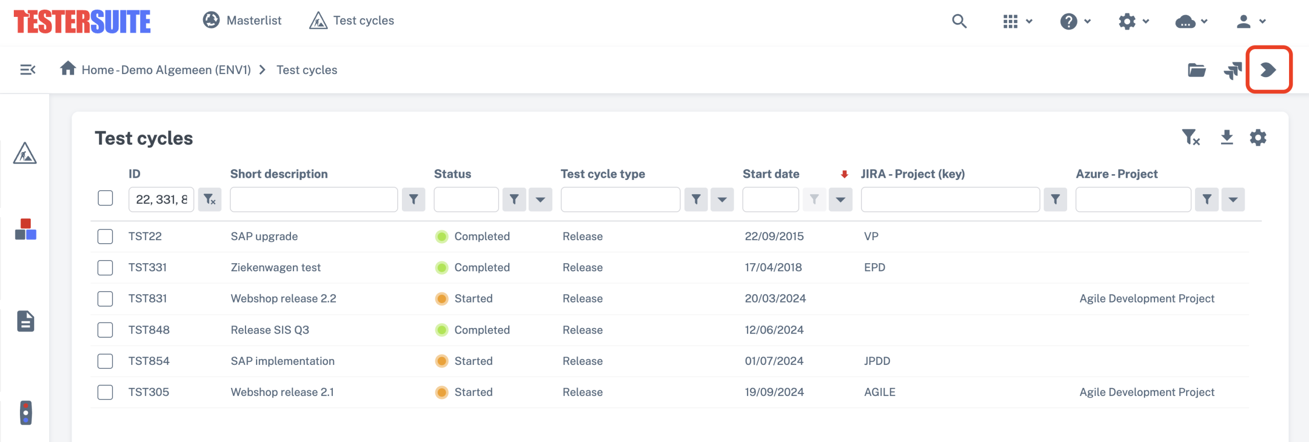 In deze lijst kun je op verschillende manieren filteren en zoeken om de gewenste wijzigingen te vinden. Zo kun je bijvoorbeeld alleen wijzigingen met een bepaalde status, of van een bepaalde versie ophalen. Selecteer de wijzigingen die je wil testen in Testersuite en klik op de knop ‘Testtraject selecteren’.