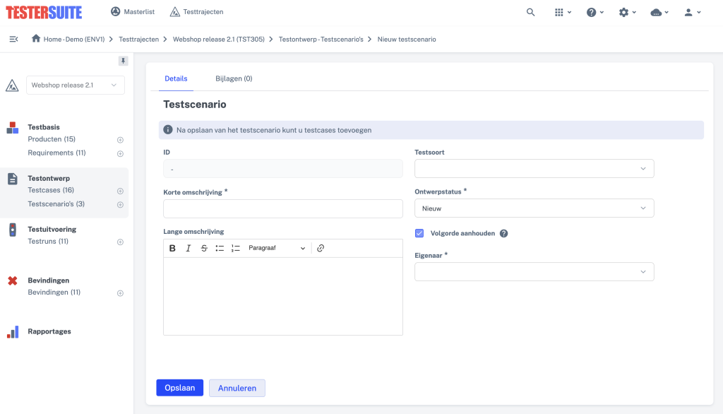 In de lijst met testscenario’s kun je met de functieknop Nieuw een nieuw testscenario maken. Op dat moment wordt gevraagd om de detailgegevens in te voeren. Als de gegevens zijn ingevoerd en het testscenario is opgeslagen dan kun je testcases toevoegen. Met het standaard veld ‘volgorde aanhouden’ geef je aan of de testcases in een testscenario op de aangegeven volgorde moeten worden uitgevoerd, of niet. Wanneer je een testrun aanmaakt van het testscenario wordt dit automatisch overgenomen.