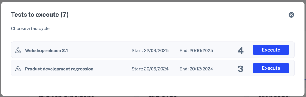 In deze lightbox worden jouw uit te voeren tests per testtraject getoond. Voor ieder testtraject wordt het totaal aantal tests weergegeven. In dit voorbeeld moet je in het testtraject Webshop release 2.1 in totaal vier tests uitvoeren. Wanneer je klikt op Uitvoeren achter het testtraject Webshop release 2.1 ga je naar het scherm met de door jou uit te voeren tests binnen het gekozen testtraject: